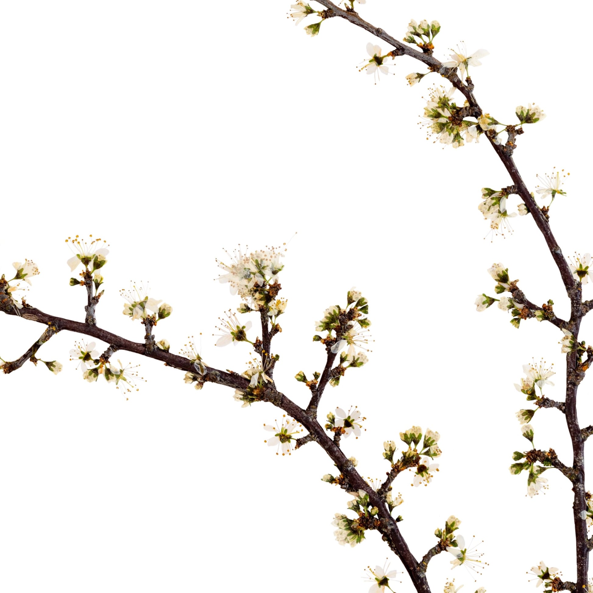 Pressed Irish Blackthorn - finely detailed photographs of real blackthorn blossoms, carefully gathered, pressed, and arranged before being photographed and printed on archival fine-art paper.