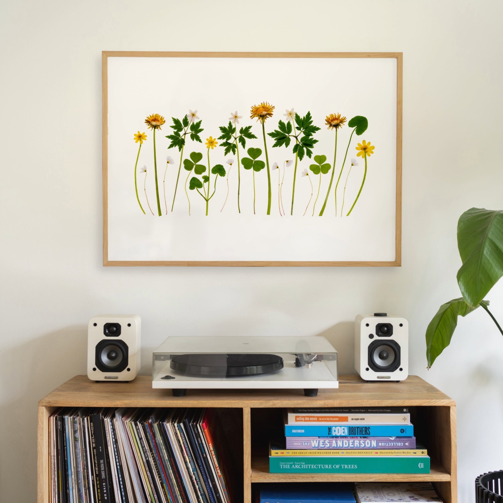 Pressed Irish Spring Wildflowers - finely detailed photographs of real wildflowers and leaves, carefully gathered, pressed, and arranged before being photographed and printed on archival fine-art paper.