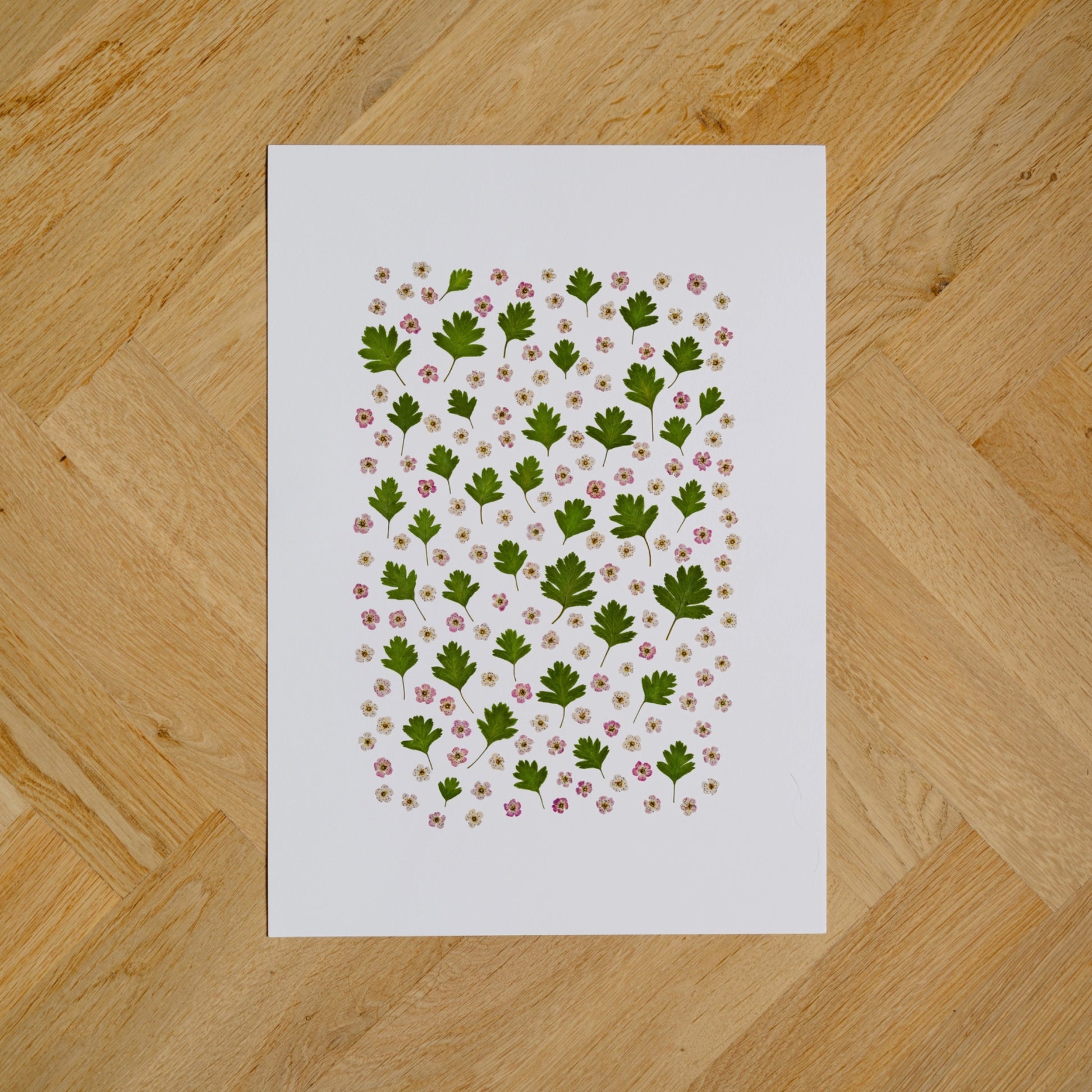 Pressed Irish Pink Hawthorn - finely detailed photographs of real hawthorn leaves and blossoms, carefully gathered, pressed, and arranged before being photographed and printed on archival fine-art paper.