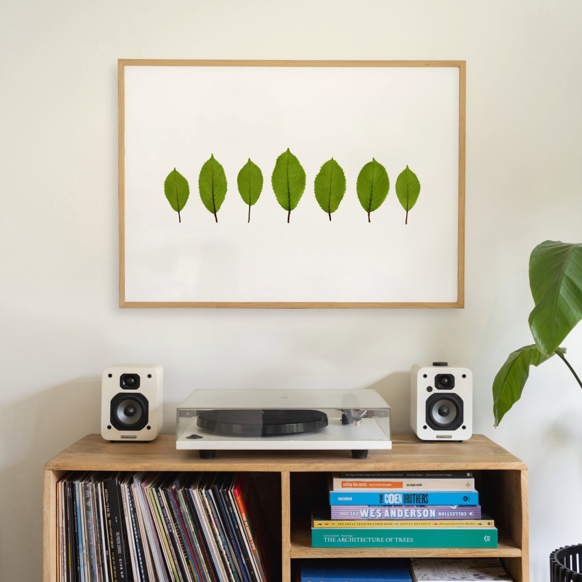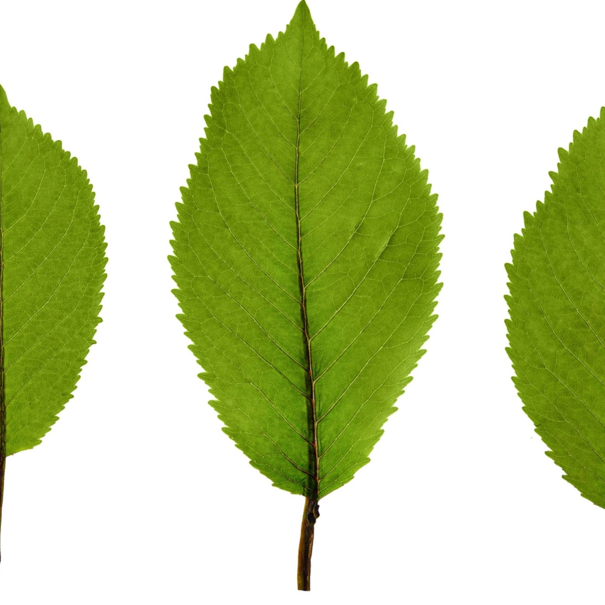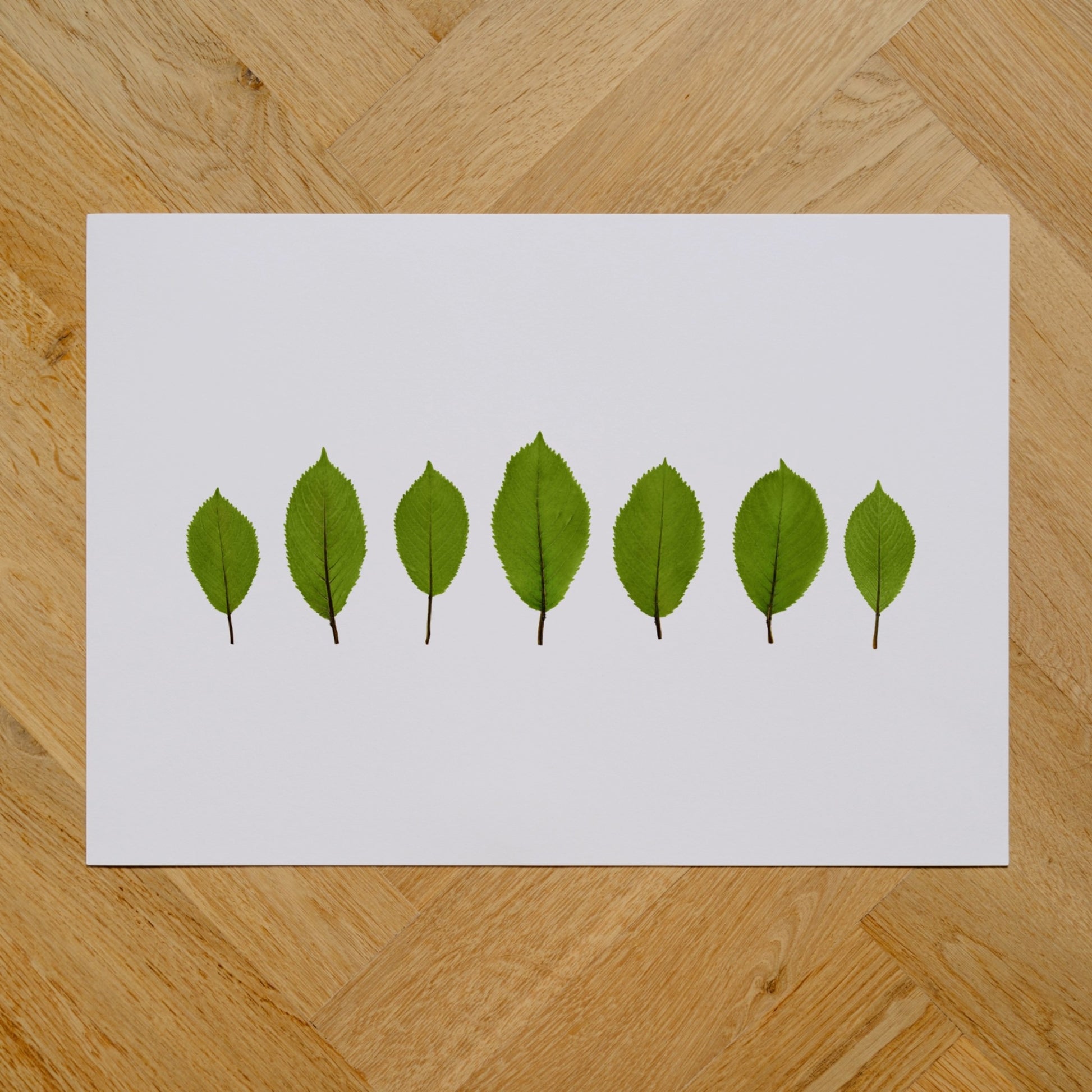 Pressed Irish Wild Cherry Leaves - finely detailed photographs of real wild cherry leaves, carefully gathered, pressed, and arranged before being photographed and printed on archival fine-art paper.