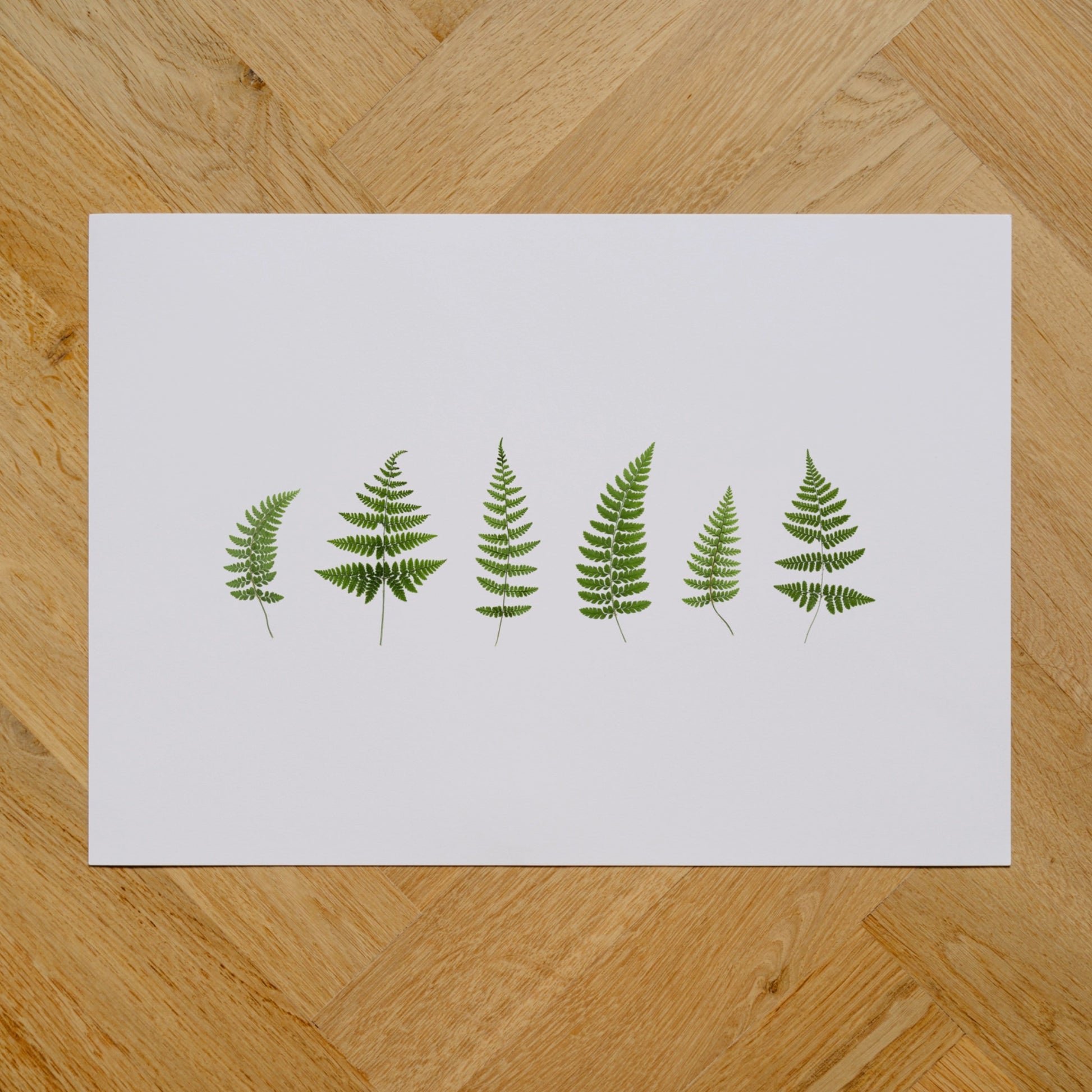 Pressed Woodland Ferns - finely detailed photographs of six real ferns, carefully gathered, pressed, and arranged before being photographed and printed on archival fine-art paper.